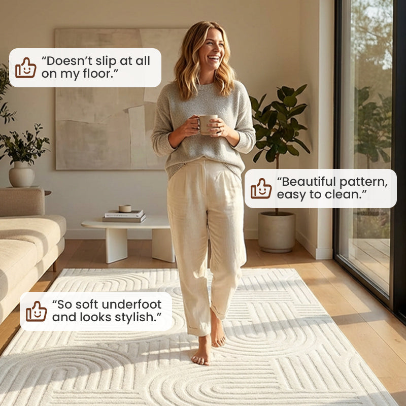 GEOMETRISCHES MUSTER – Bietet die beeindruckende visuelle Tiefe eines Hoch-Tief-skulpturierten Teppichs mit modernem Bogen- und Liniendesign. Dies schafft einen anspruchsvollen Blickfang, ohne die Schwierigkeiten der Reinigung erhabener Strukturen.